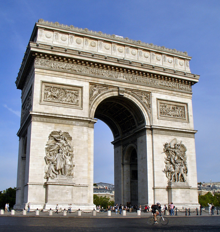 Situé sur la place de l’Étoile, en haut de l’avenue des Champs-Élysées, il est le plus grand arc du monde. Sa construction est daté de 1806, à la demande de Napoléon, pour célébrer la victoire de l’empereur à Austerlitz. Les sculptures sont signées Cortot, Rude, Etex, Pradier et Lemaire. Sous l’arc se trouve la tombe du Soldat Inconnu, dont la flamme est ravivée tous les soirs à 18h30. Au sommet du monument, le visiteur profite d’une vue panoramique de Paris, de jour comme de nuit, et de deux tables d’orientation. Un musée retraçant l’histoire de l’Arc de triomphe, situé à l’intérieur de l’édifice.